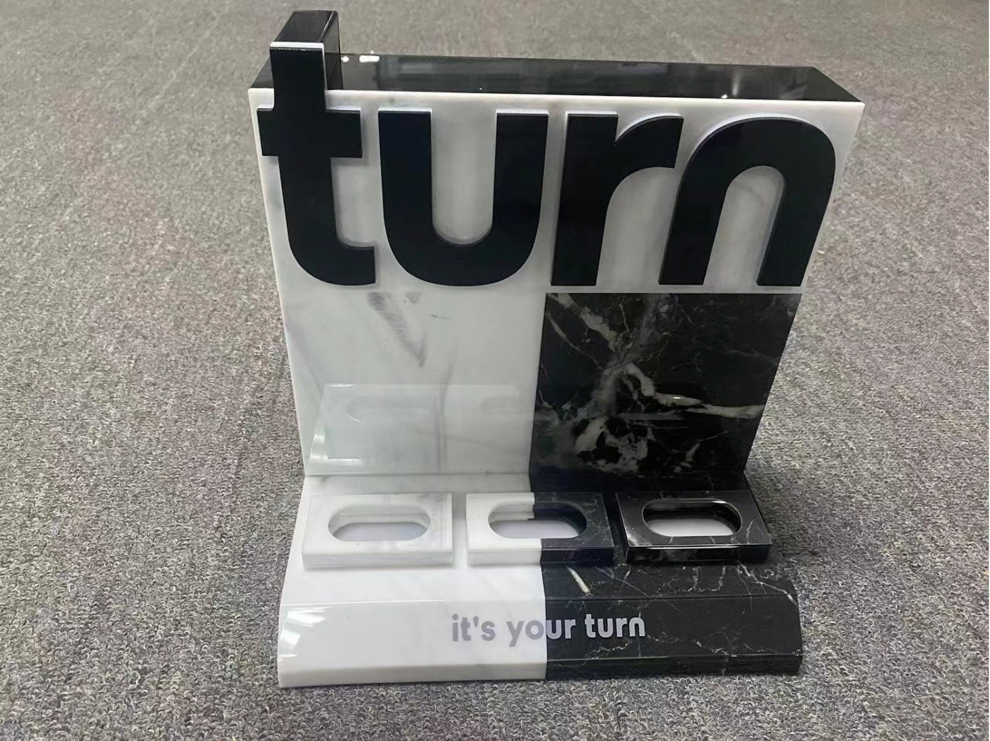 This triple podpak display combines bold branding with premium materials for a striking countertop presence. Made from black and white faux marble acrylic, it features a large dimensional turn logo, a front-facing message that reads “it’s your turn,” and three recessed slots to securely hold individual podpak units. A built-in clear backer adds structure and allows for signage or visual inserts. Eye-catching and durable, this display is built to elevate the brand and protect the product in any retail setting.